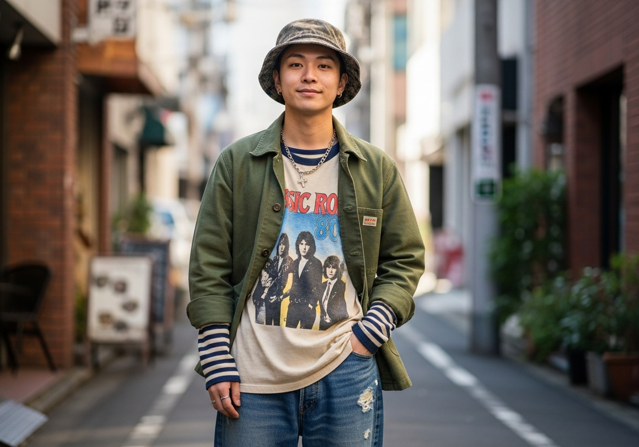 【ここに「古着を使ったおしゃれなコーディネート例(安価で手に入る定番アイテムが中心)」の写真を挿入】